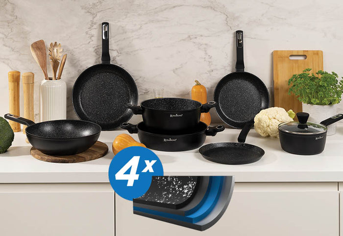 - 4-Schicht-Kochgeschirr mit antihaftender Mineralbeschichtung für fettarmes Kochen und gesündere Gerichte.