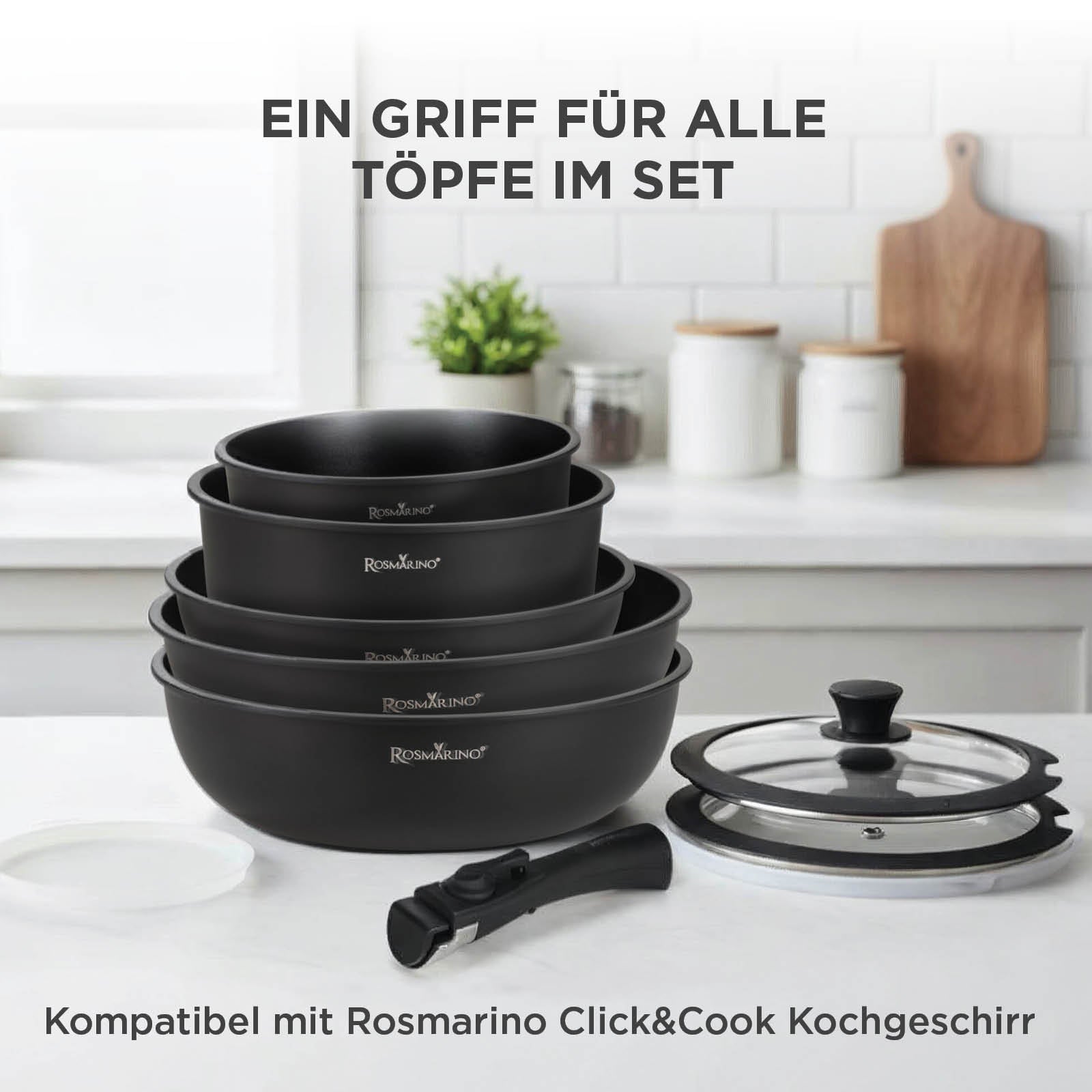Der Griff wurde speziell für das Rosmarino Click&Cook Kochgeschirr entwickelt und passt perfekt zu allen Töpfen des Sets. Ein System, unendliche Möglichkeiten.