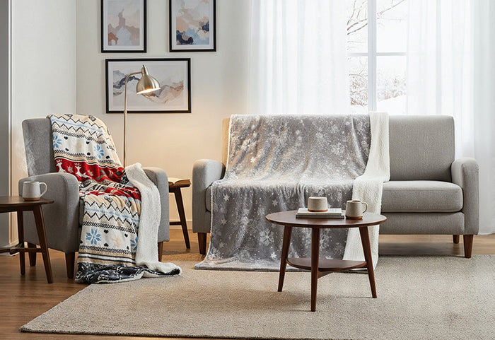 • Doppelseitige Decke in ruhigen Farben oder mit Wintermuster, die jedes Interieur elegant aufwertet.