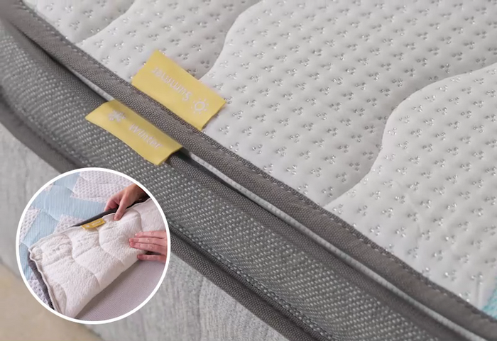 • Für maximalen Komfort und eine trockene Liegefläche drehen Sie den saisonalen Topper auf die Sommer- oder Winterseite.