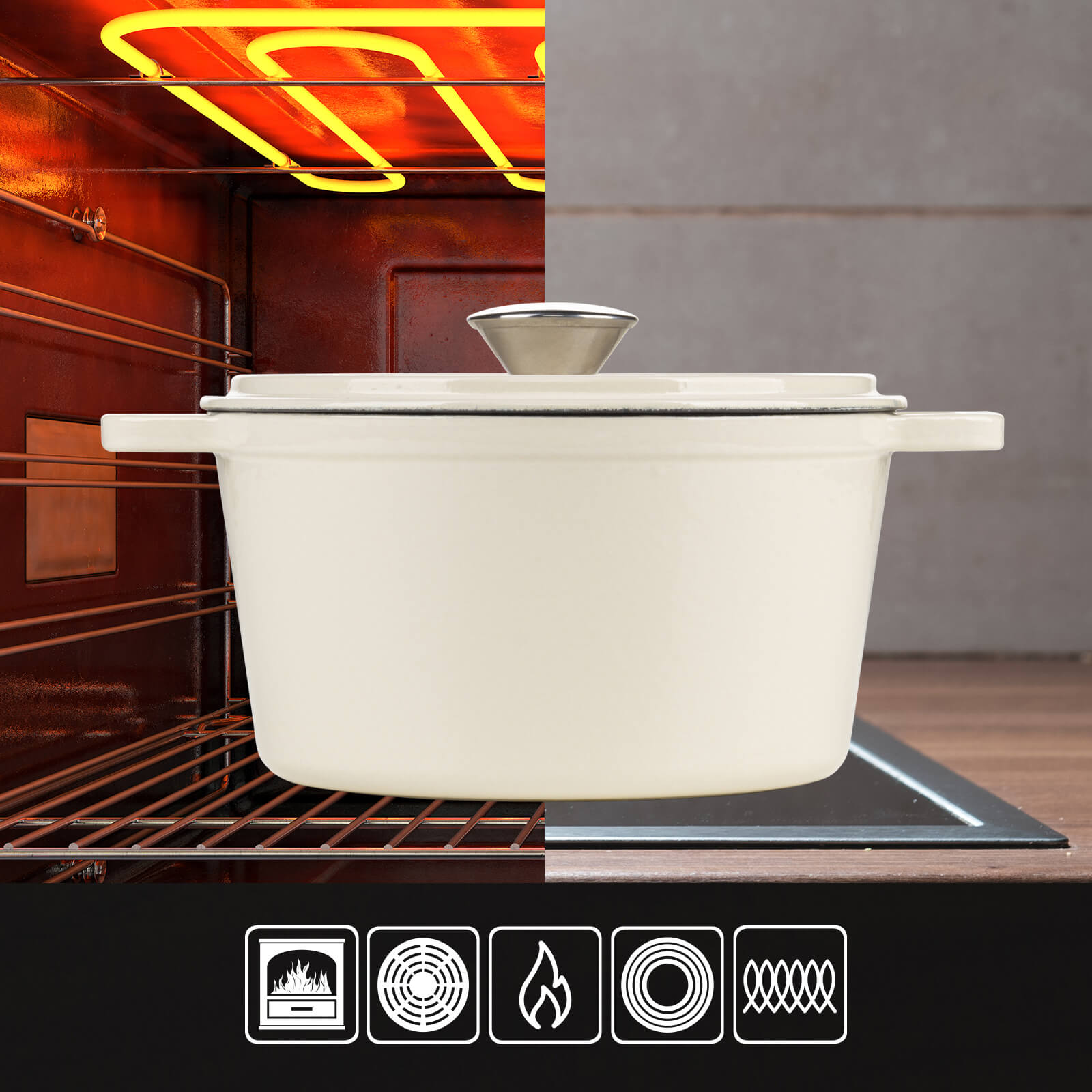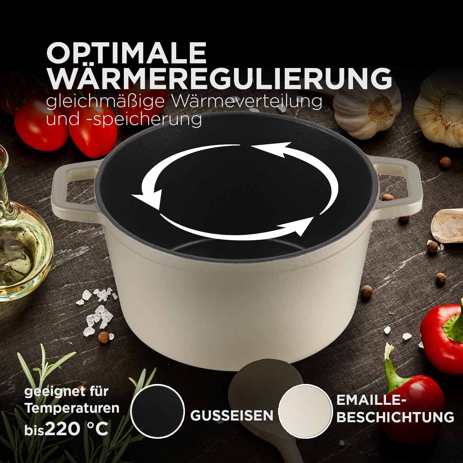 - Emaillierte Beschichtung, die das Anhaften von Speisen am Topfboden verhindert.