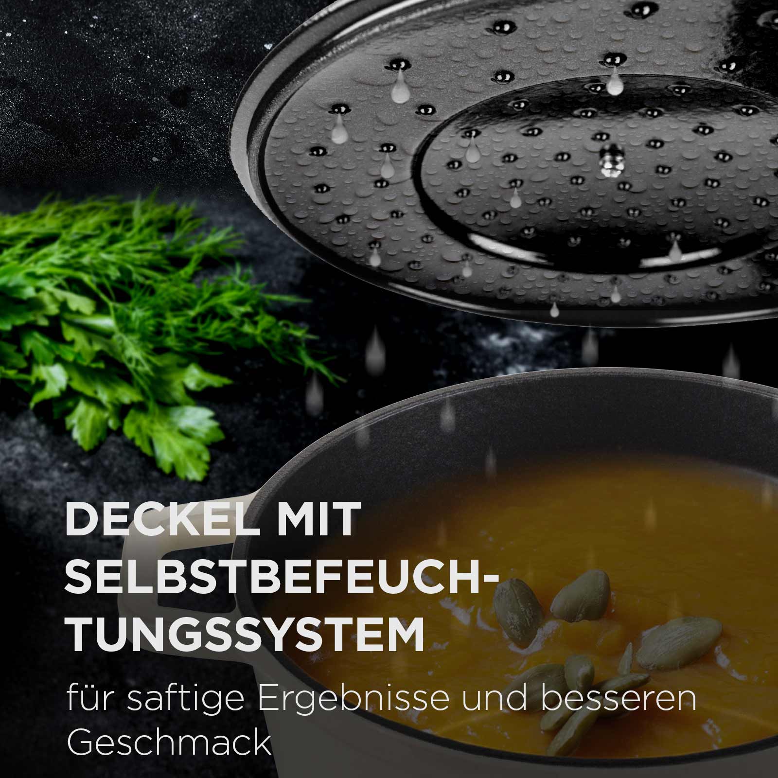 - Der speziell geformte Deckel kondensiert den Dampf, so dass der Geschmack und die Nährstoffe in den Speisen erhalten bleiben.