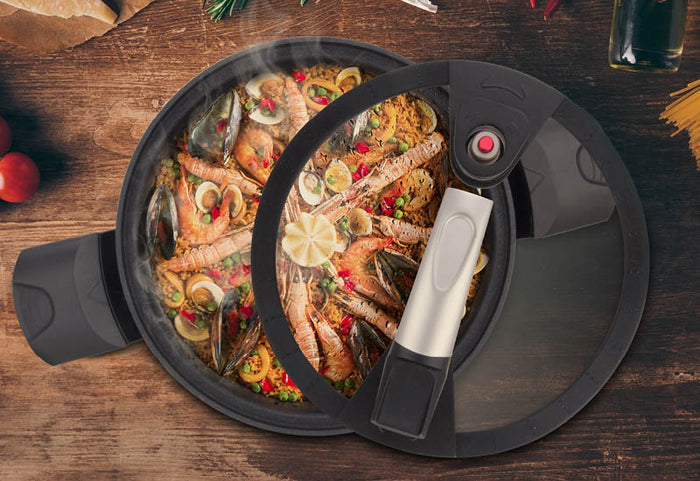 - Der innovative intelligente Deckel erleichtert das Kochen, da Sie ihn leicht anheben können, um Zutaten hinzuzufügen oder den Geschmack zu prüfen, und ihn dann wieder schließen.