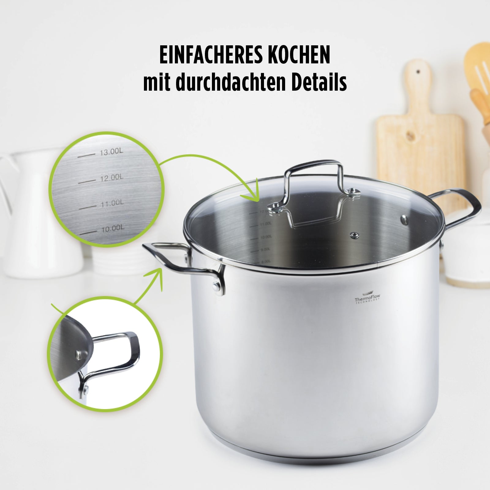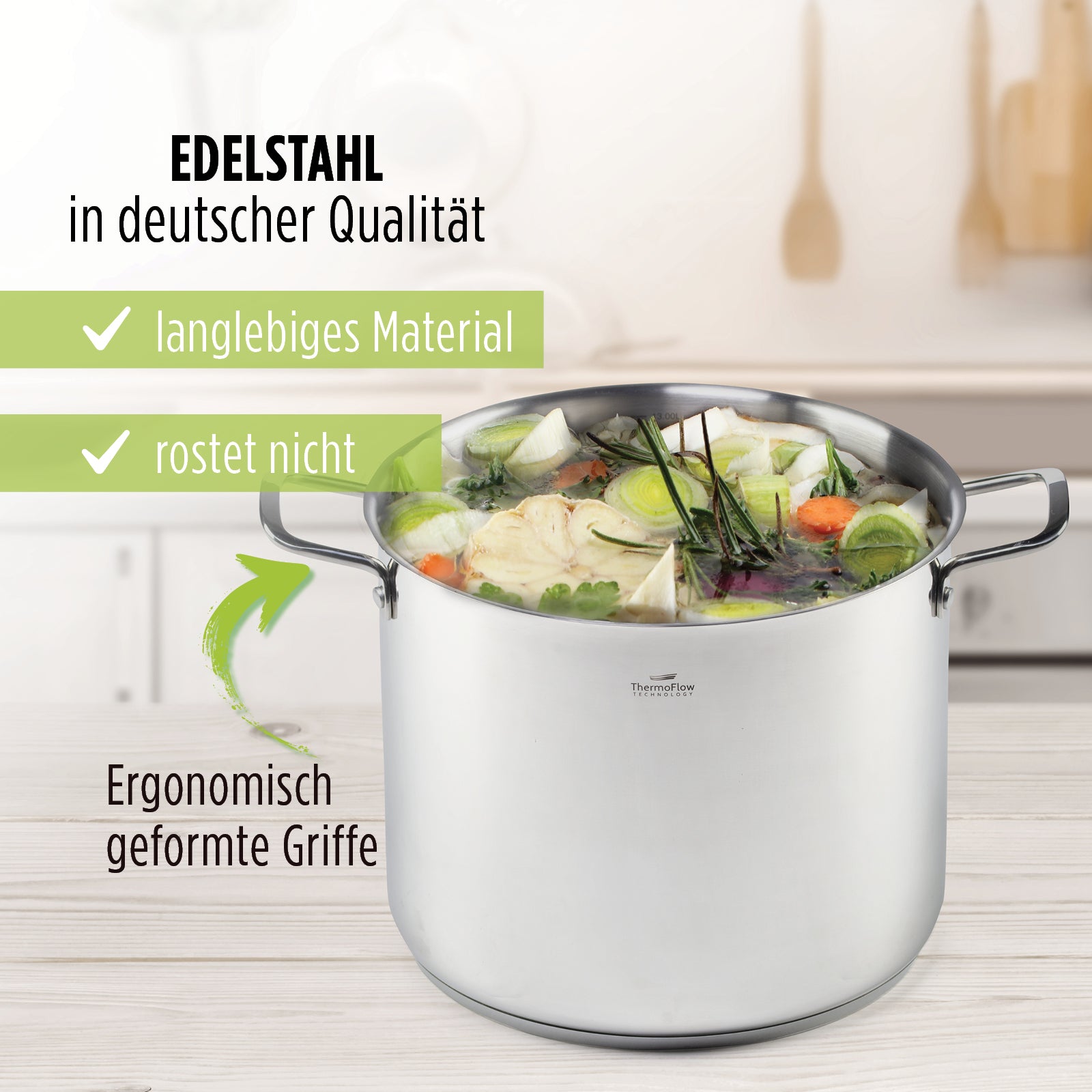 Hochwertiges Kochgeschirr aus Edelstahl 18/10 mit 3-lagigem Schlagboden für schnelles Erhitzen und gleichmäßiges Garen. Eine dicke Schicht aus hochwertigem deutschem Edelstahl, ein Aluminiumkern für gute Wärmeleitfähigkeit und eine Außenschicht aus Edelstahl sorgen für Langlebigkeit, Widerstandsfähigkeit und effizientes Kochen. Die ThermoFlow-Technologie sorgt für eine gleichmäßige Wärmeverteilung über die gesamte Oberfläche des Kochgeschirrs, so dass sich der Stahlrahmen des Kochgeschirrs richtig aufheizt und ein schnelles und äußerst effizientes Kochen ermöglicht.