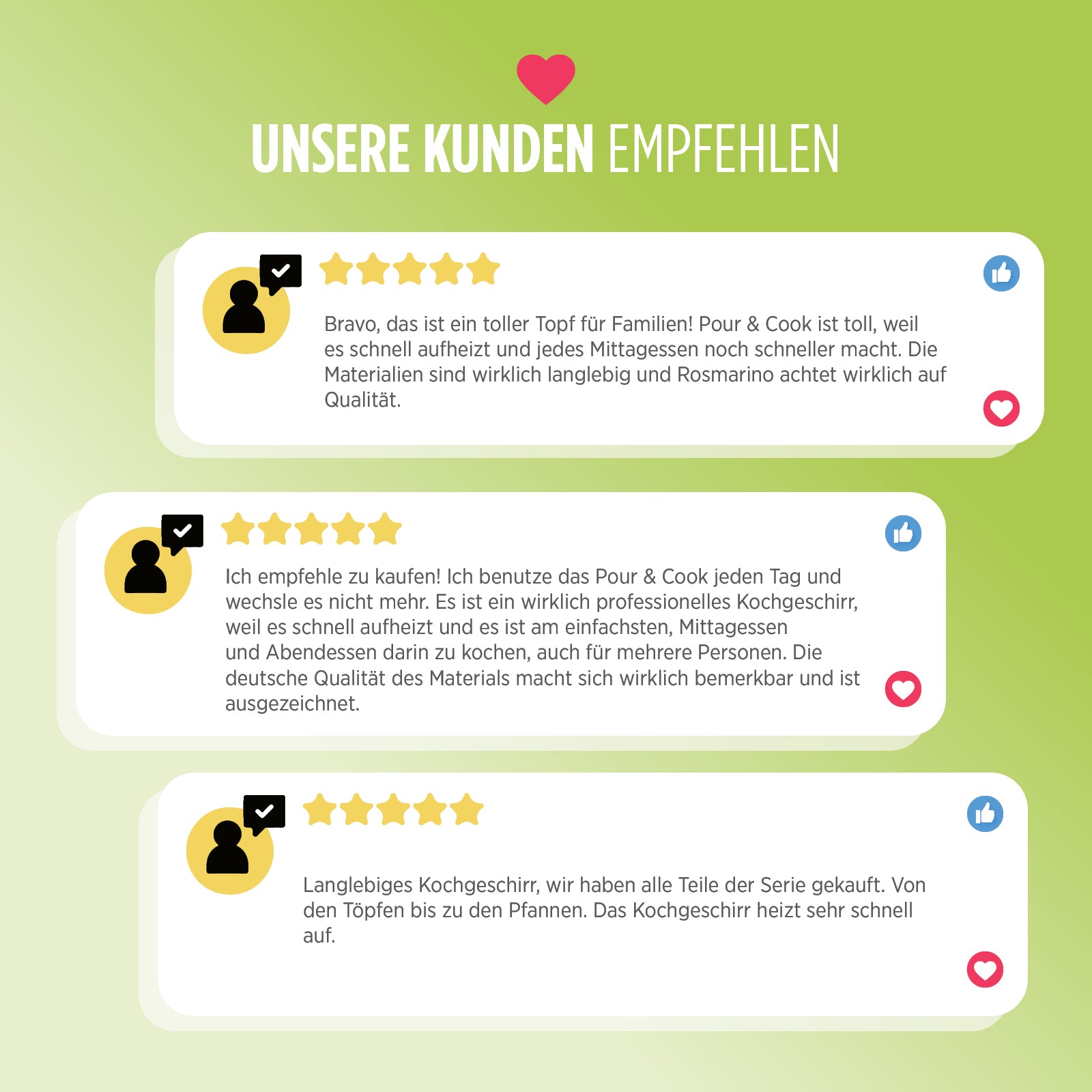 • Unser gesamtes Kochgeschirr entspricht den höchsten Standards und enthält kein schädliches PFOA oder andere schädliche Substanzen.