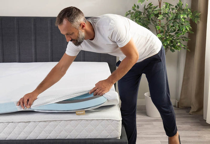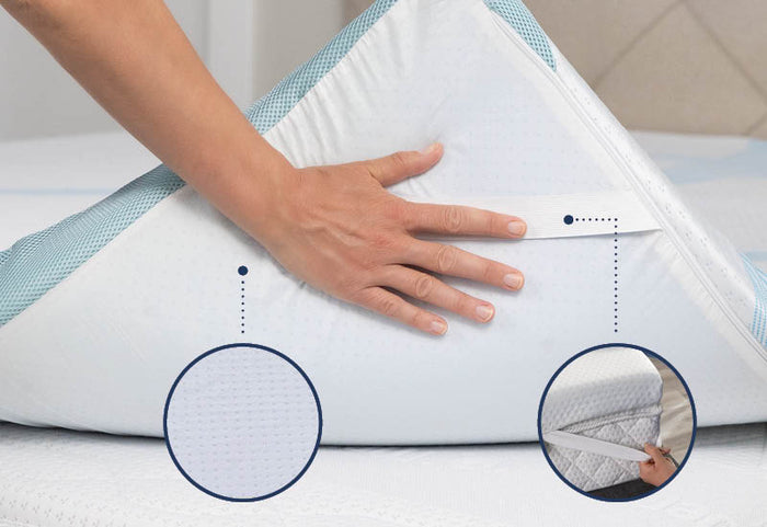 - Die Premium Matratzenauflage zeichnet sich durch ihren Kühleffekt aus, der die Temperatur reguliert und überschüssige Wärme abführt – für optimalen Schlafkomfort das ganze Jahr über.