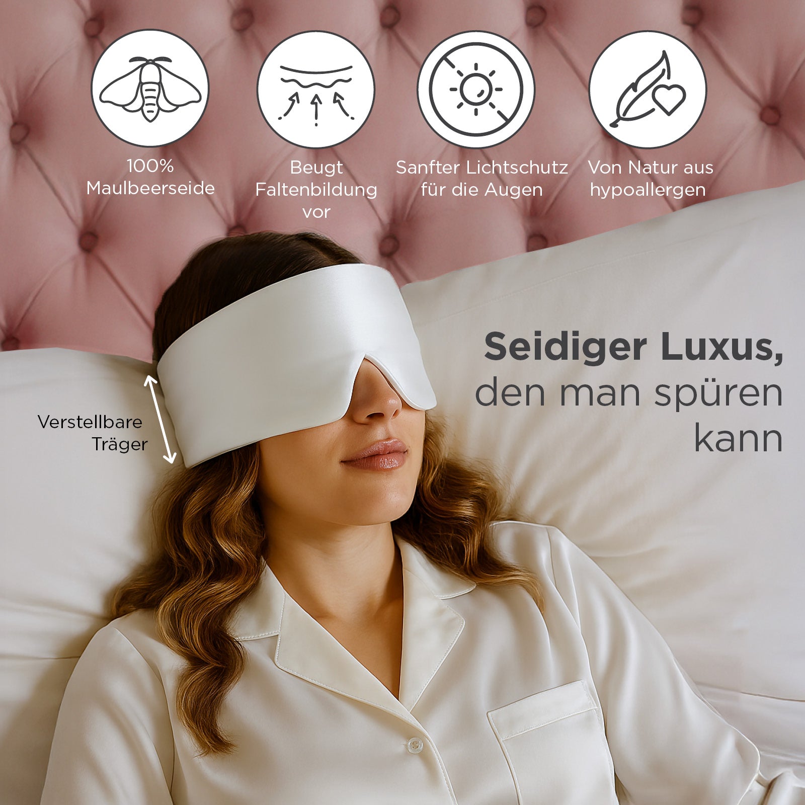 Reduzieren Sie Schwellungen und Augenringe während des Schlafs. Glatte Seide verhindert Hautreibung und nimmt keine Feuchtigkeit aus der Haut oder aus Nachtcremes auf, sodass Sie mit frischer, strahlender Haut aufwachen.