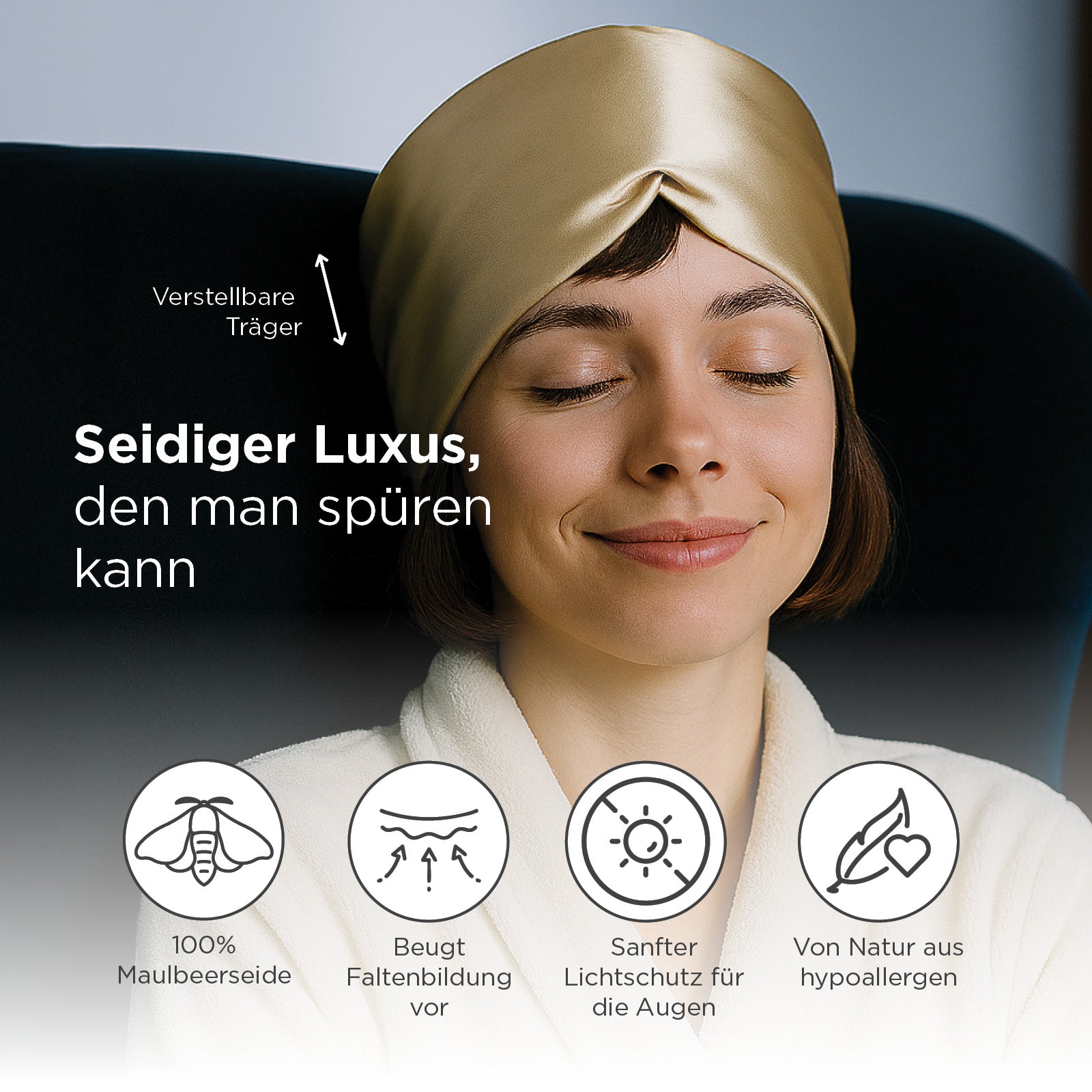 Die Svilanit-Schlafmaske wird aus Seidenfäden höchster Qualität mit einer Dichte von 22 Momme gefertigt, die trotz ihrer Kompaktheit und Blickdichtigkeit atmungsaktiv bleiben. Da Seide die Temperatur auf natürliche Weise reguliert, kühlt sie im Sommer und wärmt im Winter. Verstellbare Bänder sorgen für perfekten Sitz und einen bequemen, ununterbrochenen Schlaf.