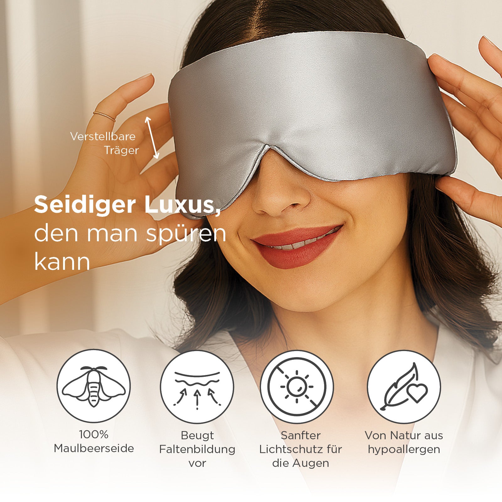 • „Meine Dermatologin hat mir eine Seidenmaske empfohlen, und nach einer Woche ist der Unterschied wirklich deutlich. Am Morgen ist meine Haut erholter, ohne Abdrücke und Falten.“ – Molly