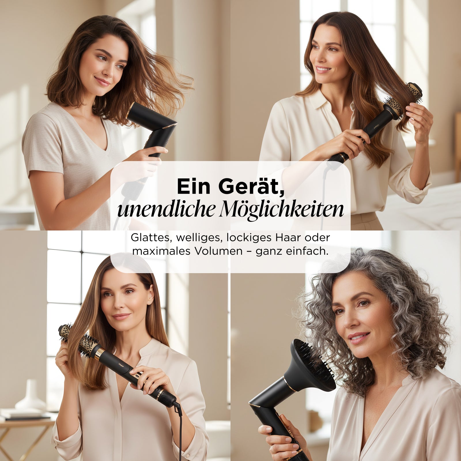 - Ein Gerät, unendliche Möglichkeiten – glatte, wellige, lockige oder voluminöse Haare ganz einfach