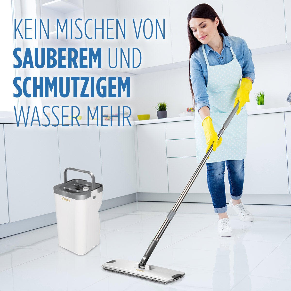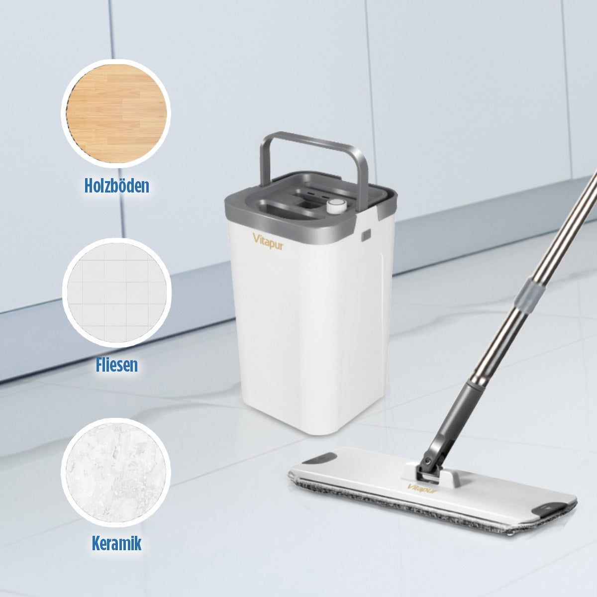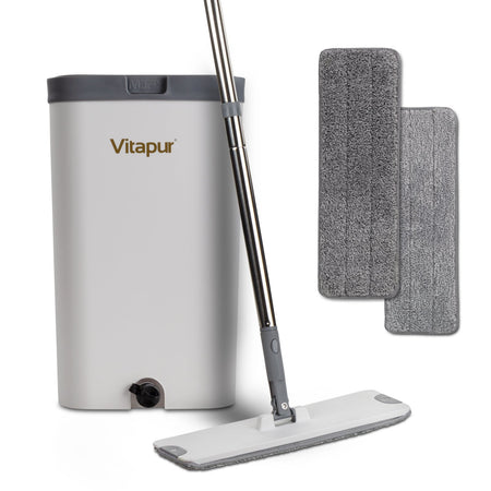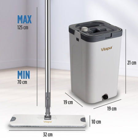 Das Vitapur 4-teilige Bodenreinigungsset revolutioniert Ihre Reinigung! Der Eimer mit einem innovativen Trennsystem für sauberes und schmutziges Wasser sorgt für eine effiziente und hygienische Reinigung. Der 360° schwenkbare Griff ermöglicht es, auch schwer erreichbare Stellen problemlos zu säubern. Ideal für die Trocken- und Nassreinigung, dank der mitgelieferten zwei Mikrofaser-Reinigungstücher. Das Set lässt sich kompakt auf nur 21 x 21 x 35,5 cm zusammenklappen und passt somit perfekt in jeden Schrank oder eignet sich hervorragend für das Ferienhaus.