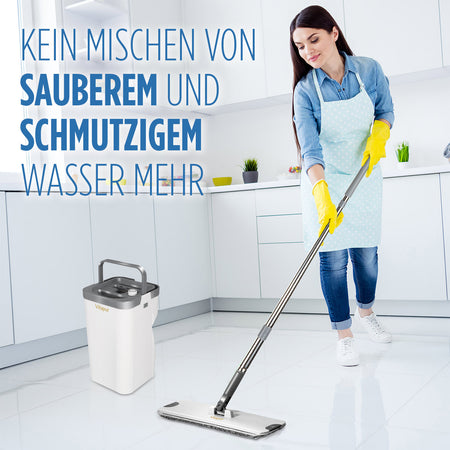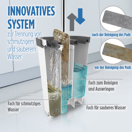 - Innovativer Eimer mit zwei Fächern – inklusive Bodenwischer und 2 Mikrofaser-Pads.