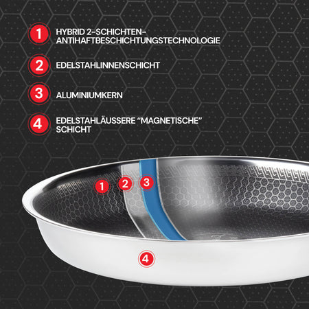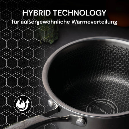 Die Haltbarkeit von Edelstahl und die Antihaft-Eigenschaften, die das Kochen noch einfacher machen. HexaPRO ist das Ergebnis innovativer Hybridtechnologie, die eine mehrschichtige Zusammensetzung des Kochgeschirrs für professionelle Ergebnisse kombiniert. Dies ist Premium-Kochgeschirr, das Ihre Kochkünste auf ein höheres Niveau hebt.