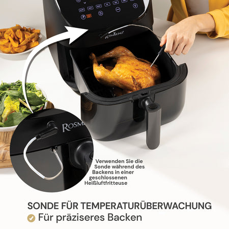 Die Rosmarino TempSense Heißluftfritteuse wurde entwickelt, um Ihnen mit minimalem Aufwand professionelle Ergebnisse zu ermöglichen. Ihr einzigartiger Vorteil ist die innovative, integrierte Temperatursonde, die sicherstellt, dass Fleisch genau nach Ihren Wünschen gegart wird. Wählen Sie einfach die Fleischsorte und den gewünschten Gargrad – die Sonde übernimmt den Rest. Das Fassungsvermögen von 6 Litern ist ideal, um Mahlzeiten für die ganze Familie oder Snacks für einen gemütlichen Abend mit Freunden zuzubereiten. Sie können zwischen 7 voreingestellten Programmen wählen und den Kochvorgang durch das transparente Fenster mit integrierter Beleuchtung jederzeit im Blick behalten. Diese Heißluftfritteuse ist die ideale Wahl für knusprig gebackene Gerichte mit weniger Fett, die Ihren gesunden Lebensstil unterstützen.