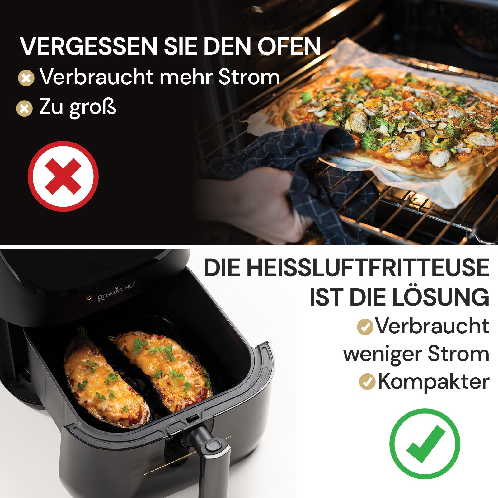 Die Heißlufttechnologie ermöglicht es Ihnen, mit minimalem Öl zu kochen und dennoch die Knusprigkeit und den köstlichen Geschmack Ihrer Gerichte zu bewahren. Heiße Luft zirkuliert um das Lebensmittel und erhitzt es von allen Seiten, um eine gleichmäßige Bräunung zu gewährleisten. Die Gerichte sind außen knusprig und innen zart. Ein weiterer Vorteil gegenüber dem Ofen ist, dass Ihre Küche nicht mit unangenehmen Kochgerüchen gefüllt wird.