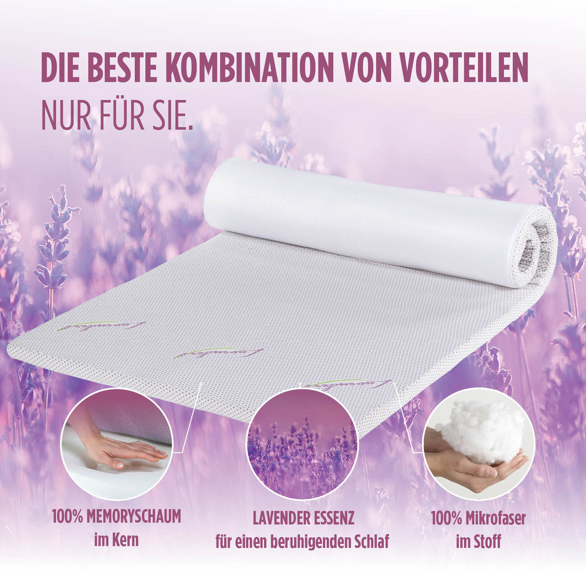 Der beruhigende Duft von Lavendel hilft, die Schlafqualität weiter zu verbessern. Der Matratzentopper ist daher für alle geeignet, die unter Alltagsstress, Schlaflosigkeit und Erschöpfung leiden. Natürlicher Lavendel ist für seine positive Wirkung bekannt, da er hilft, Unruhe zu lindern und eine beruhigende Wirkung auf die Haut hat.