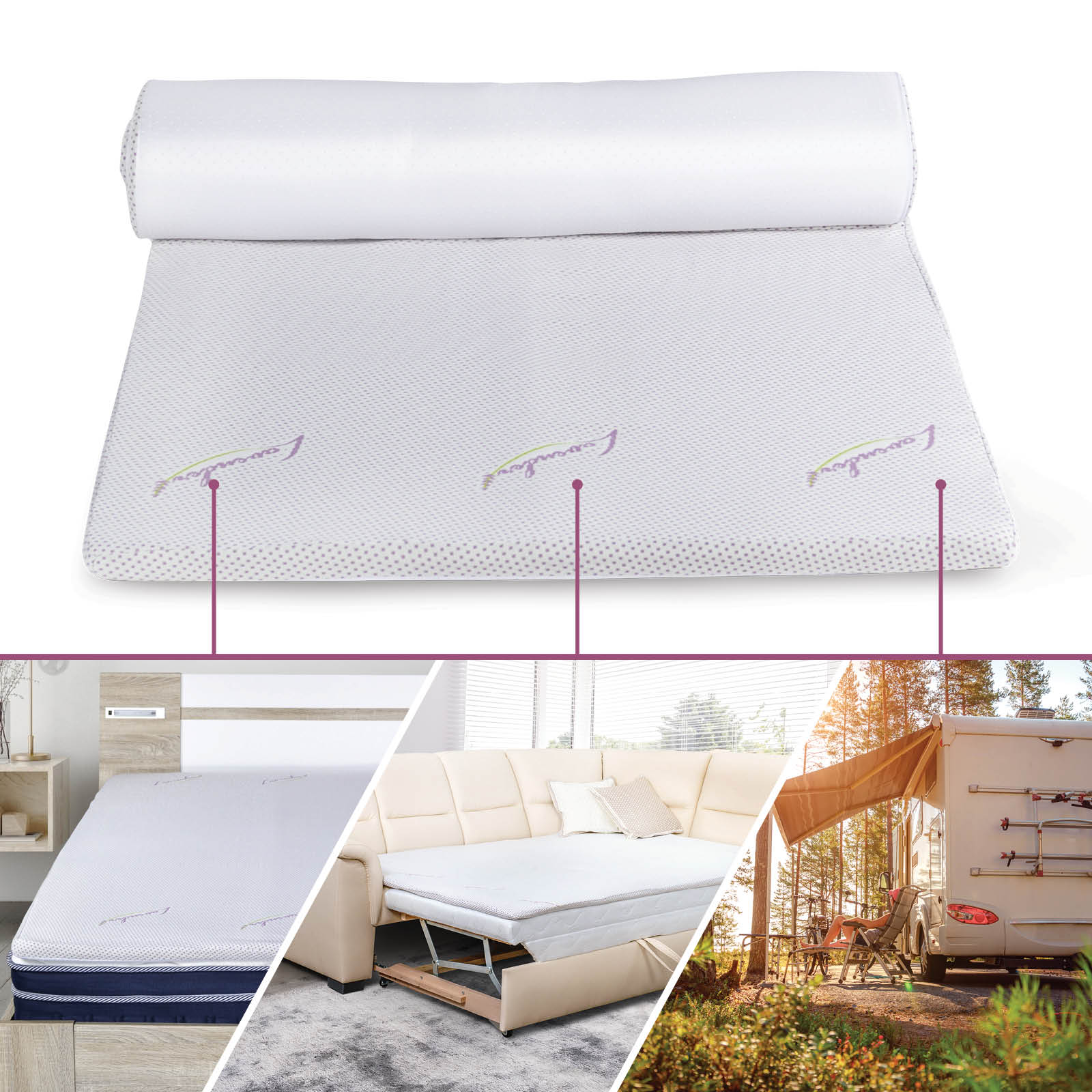 Der Matratzentopper ist die perfekte schnelle und einfache Lösung, wenn Sie Ihren Schlaf verbessern wollen. Legen Sie Lavender Memory einfach über Ihre abgenutzte Matratze oder Ihr unbequemes Sofa und spüren Sie den Unterschied.