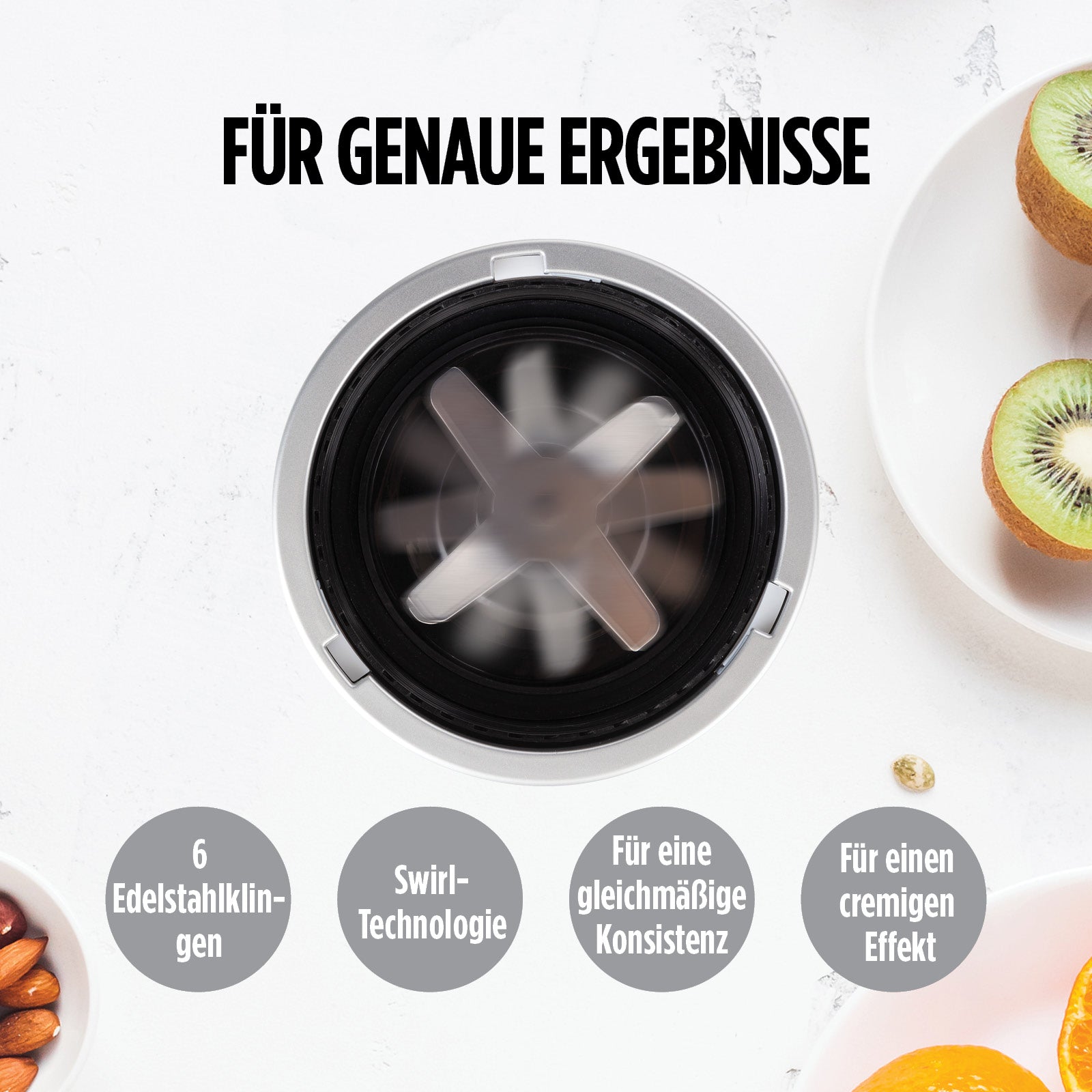 - Die scharfen Edelstahlklingen zerkleinern* auch Eis oder gefrorenes Obst, so dass Sie die Zutaten gleichmäßig mixen können. *NICHT geeignet zum Zerkleinern von Eis oder Obst ohne zusätzliche Flüssigkeit. Immer Flüssigkeit hinzufügen.
