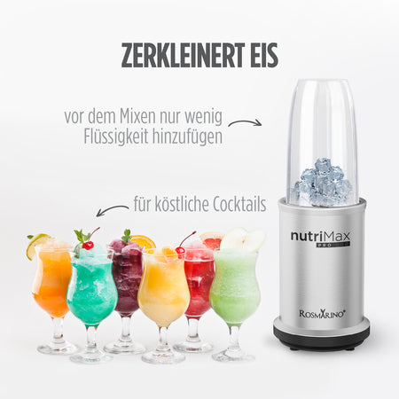 Sie lieben erfrischende Cocktails? Der NutriMax PRO ist so leistungsstark, dass er sogar Eiswürfel und gefrorenes Obst in nur wenigen Sekunden zerkleinert. Die scharfen Edelstahlklingen ermöglichen ein gleichmäßiges und präzises Mixen. Fügen Sie vor der Zubereitung einfach ein wenig Wasser, Milch oder Saft hinzu und genießen Sie. Das fertige Getränk ist vollmundig und noch cremiger als mit einem herkömmlichen Mixer.