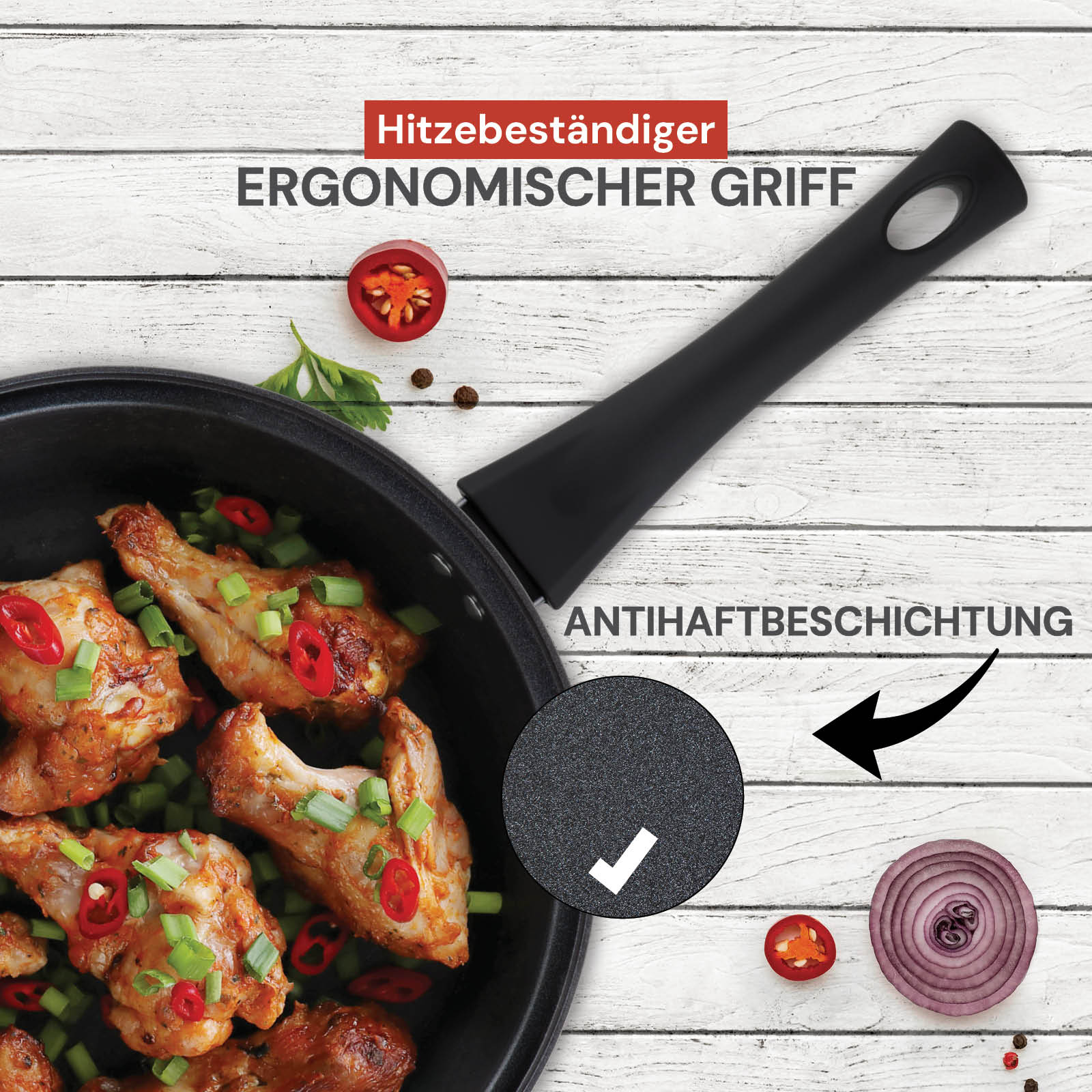- Die Antihaftbeschichtung ermöglicht den Einsatz von weniger Fett und eine einfache Reinigung.