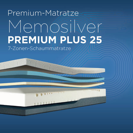 Die 25 cm hohe MemoSilver Premium Plus 25 kombiniert drei intelligente Schaumschichten: Der 7-Zonen-Stützschaum gibt dort mehr Halt, wo Ihr Körper ihn braucht, und entlastet Druckstellen. Spezielle Rillen im Schaum fördern die Luftzirkulation und leiten Wärme effizient ab – für ein perfektes Schlafklima.