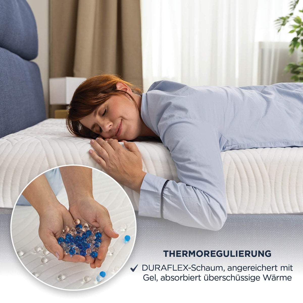 - Duraflex-Schaum mit Mikrogelsphären reguliert effektiv die Temperatur und leitet überschüssige Wärme für ein frisches Gefühl ab.