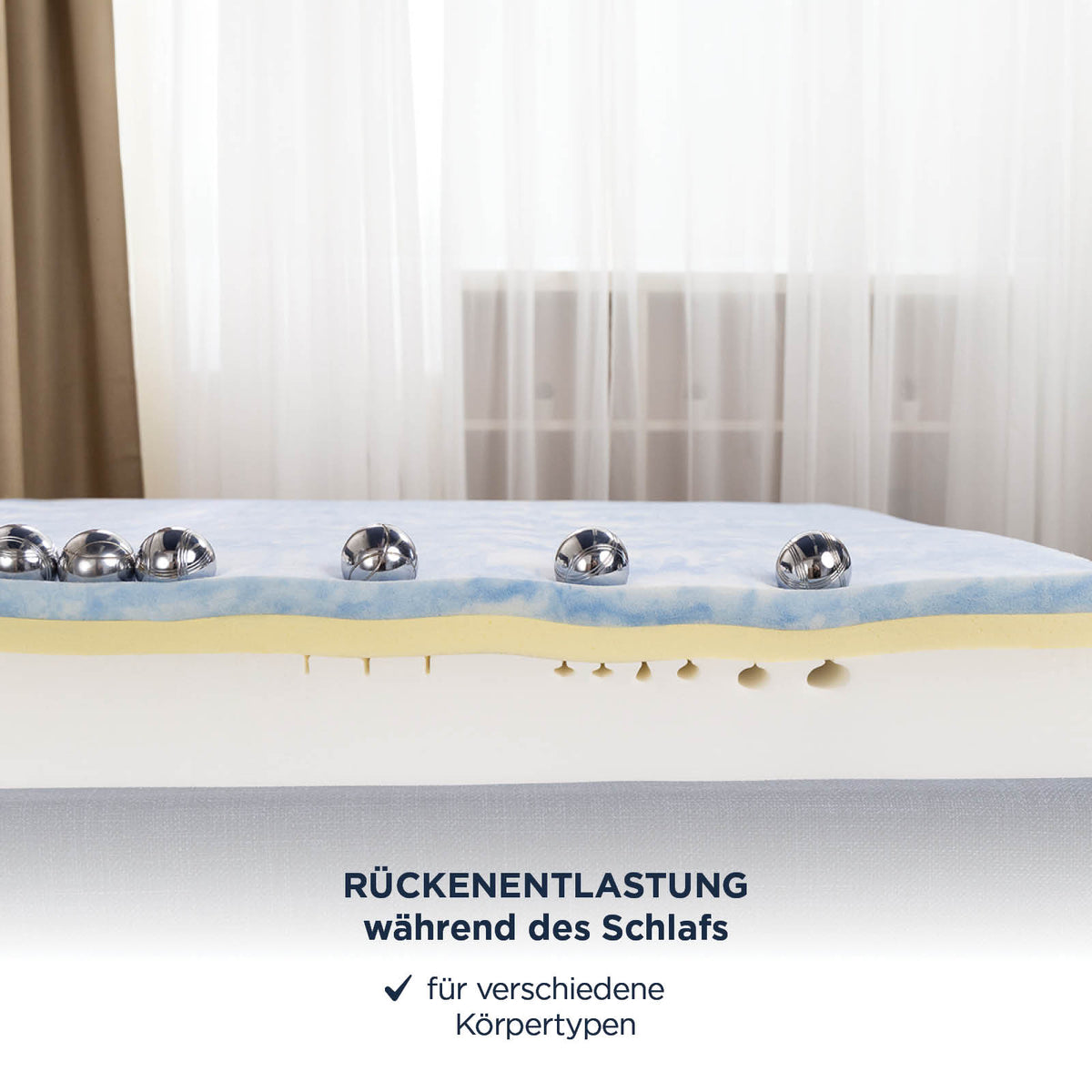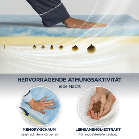 - Schaum mit mikroverkapseltem Gel reguliert die Temperatur für einen angenehmen Schlaf zu jeder Jahreszeit.