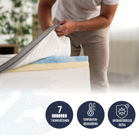 - 7 Zonen mit unterschiedlicher Härte bieten optimale Unterstützung für den Körper an allen Druckpunkten und tragen zu einem schmerzfreien, qualitativ hochwertigen Schlaf bei.