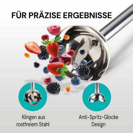- Der untere Teil des Stabmixers mit den Klingen ist so gestaltet, dass das Spritzen von Flüssigkeiten beim Zerkleinern von Zutaten minimiert wird.