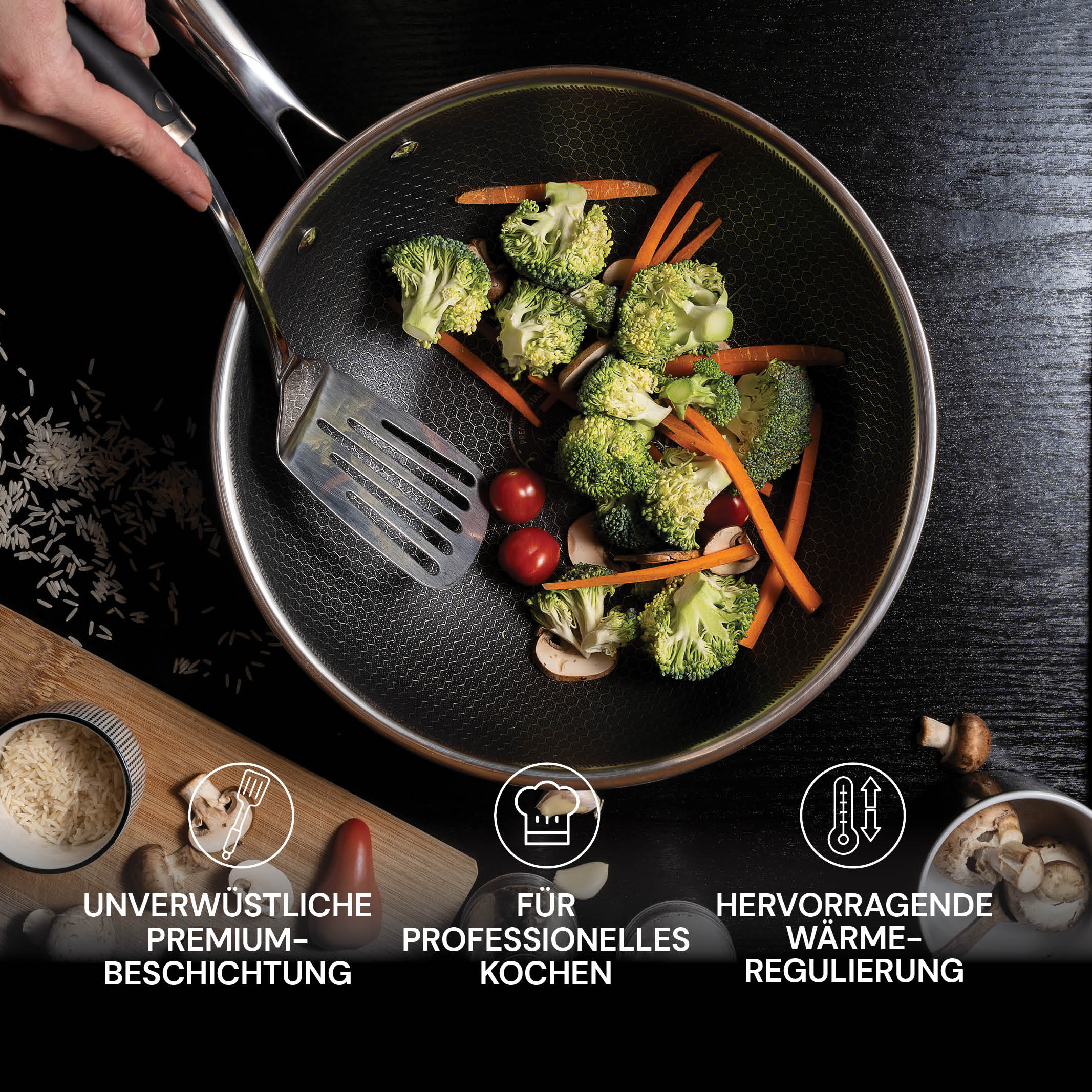 Perfektes Kochen ohne Anhaften und kühle Griffe.