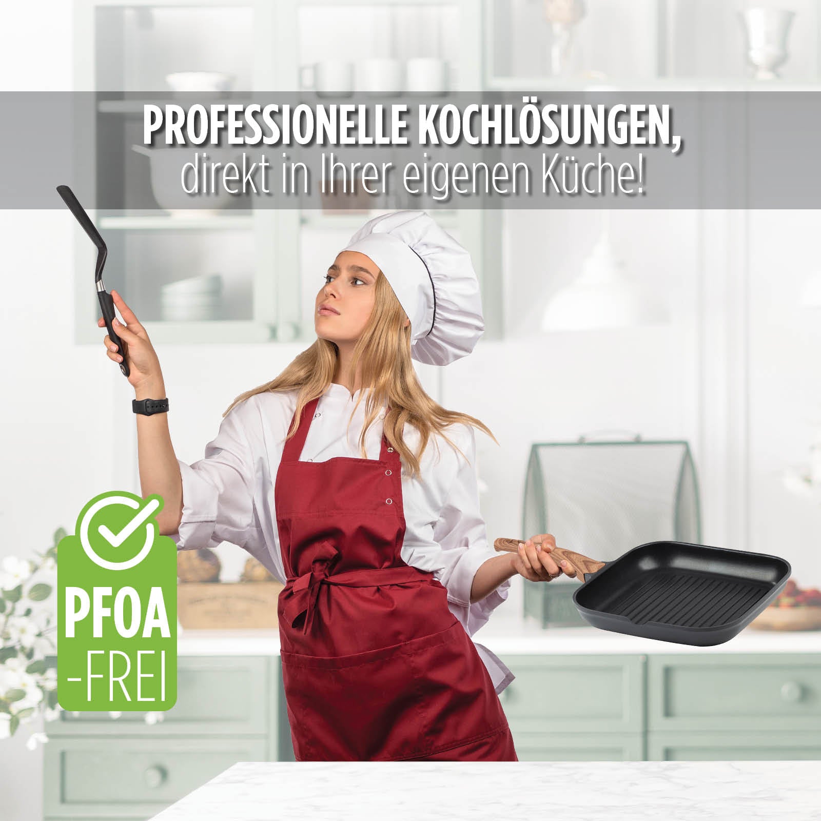 • Unser gesamtes Kochgeschirr wird nach höchsten Standards gefertigt und ist frei von schädlichem PFOA und anderen gesundheitsgefährdenden Stoffen.