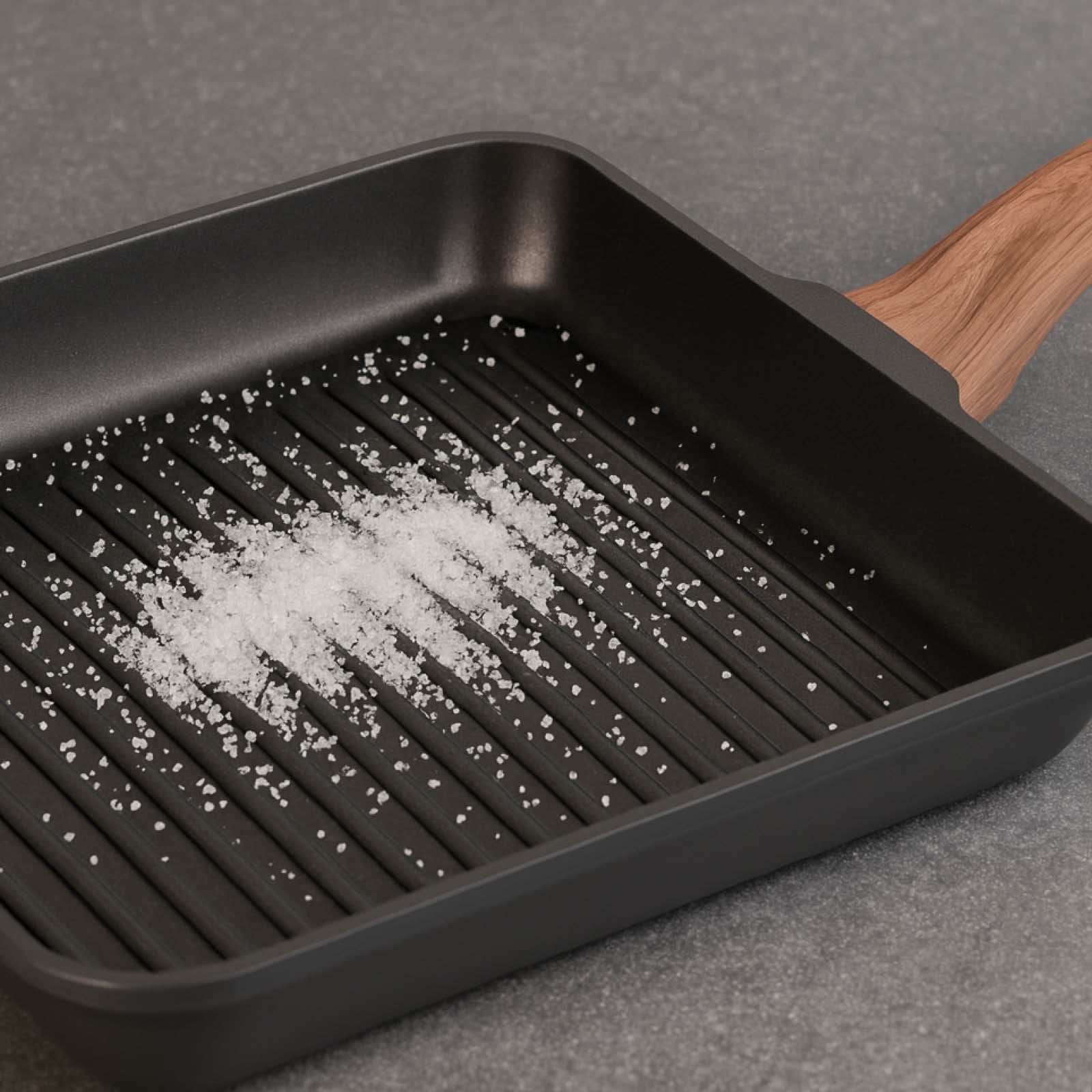 Der Körper des Kochgeschirrs besteht aus einer Schicht aus Aluminiumguss, die dicker, schwerer und energieeffizienter ist und somit eine noch längere Lebensdauer gewährleistet. Kochgeschirr aus Aluminiumguss erhitzt sich schneller, sodass Speisen auch nach dem Kochen länger heiß bleiben. Das Innere des Aluminiumgusses ist mit einer zentralen Mineralbeschichtung versehen, die für Festigkeit und Widerstandsfähigkeit sorgt, gefolgt von einer Schicht aus glatten Mineralpartikeln und einer abschließenden Schutzschicht, die das Anhaften von Speisen verringert und das Kochen mit minimaler Fettmenge ermöglicht.