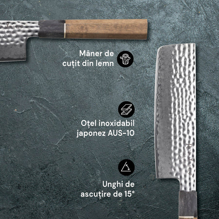 Die Klinge des Küchenmessers besteht aus AUS-10 rostfreiem Stahl aus der japanischen AICHI-Schmiede, bekannt für ihre Qualität. Das erstklassige Erscheinungsbild des Messers wird durch das charakteristische Damastmuster und den hölzernen Griff vervollständigt, der japanisches Design widerspiegelt.