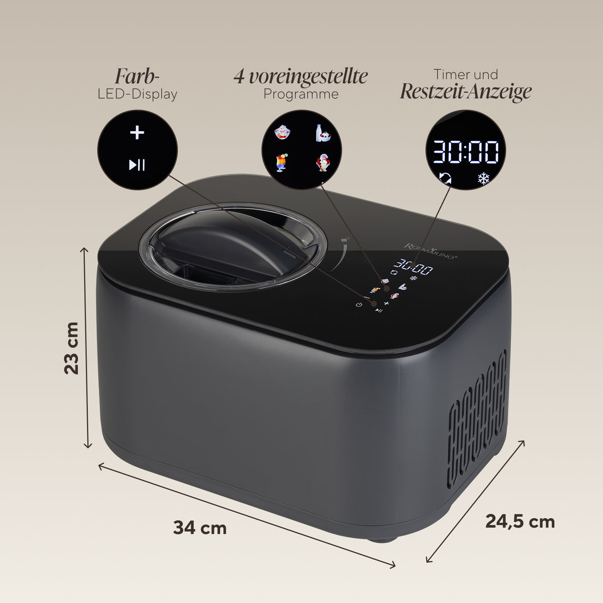 - 4 voreingestellte Programme – italienisches Gelato, Sorbet, Frozen Yogurt, Slushies