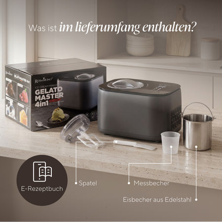 - Inklusive Zubehör: Edelstahl-Eisschüssel, Spatel, Messbecher und ein E-Rezeptheft