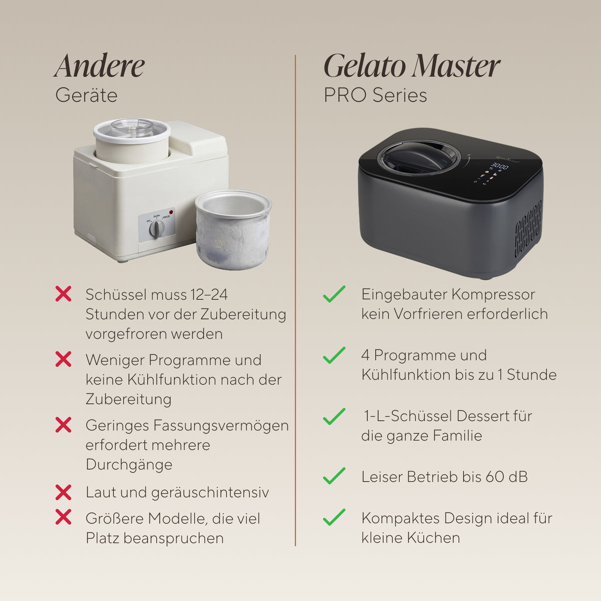 - Integrierter 100-W-Kompressor – Vorkühlen der Schüssel ist nicht erforderlich