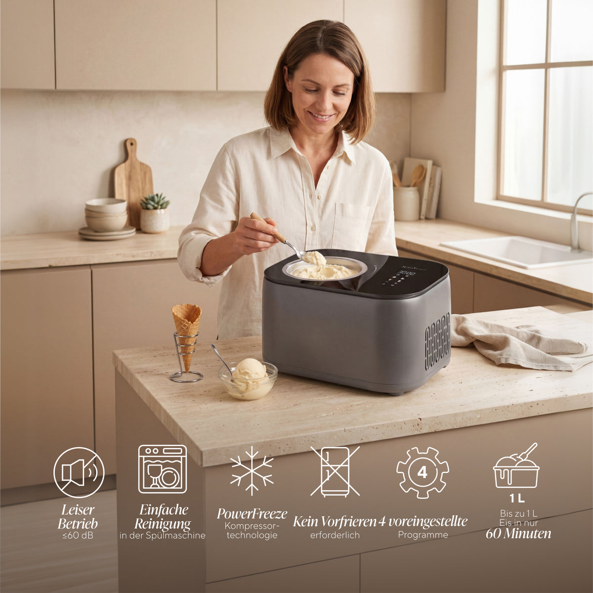 - PowerFreeze Kompressor-Technologie zur Eisherstellung ohne Vorfrieren der Schüssel oder Vorkühlen der Zutaten