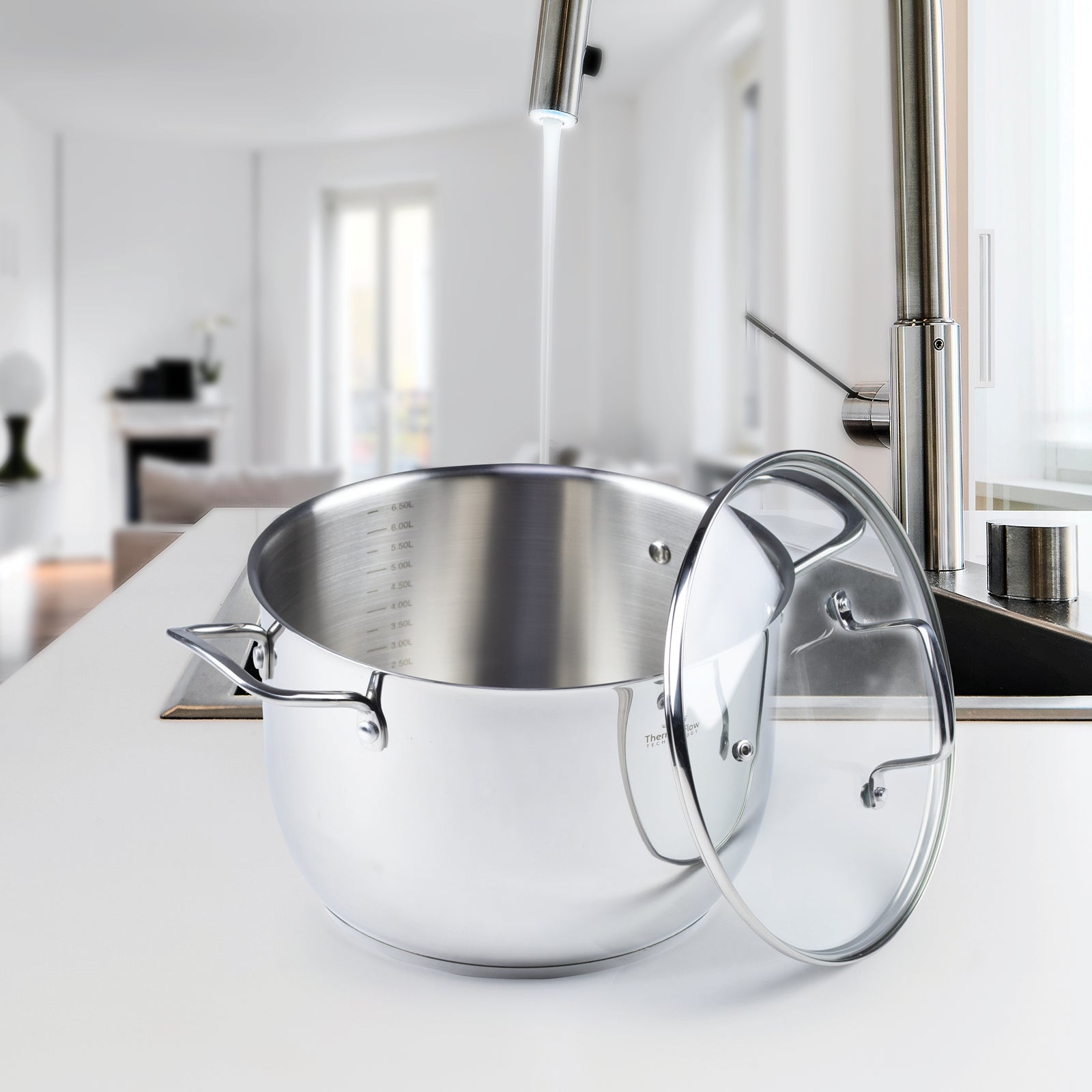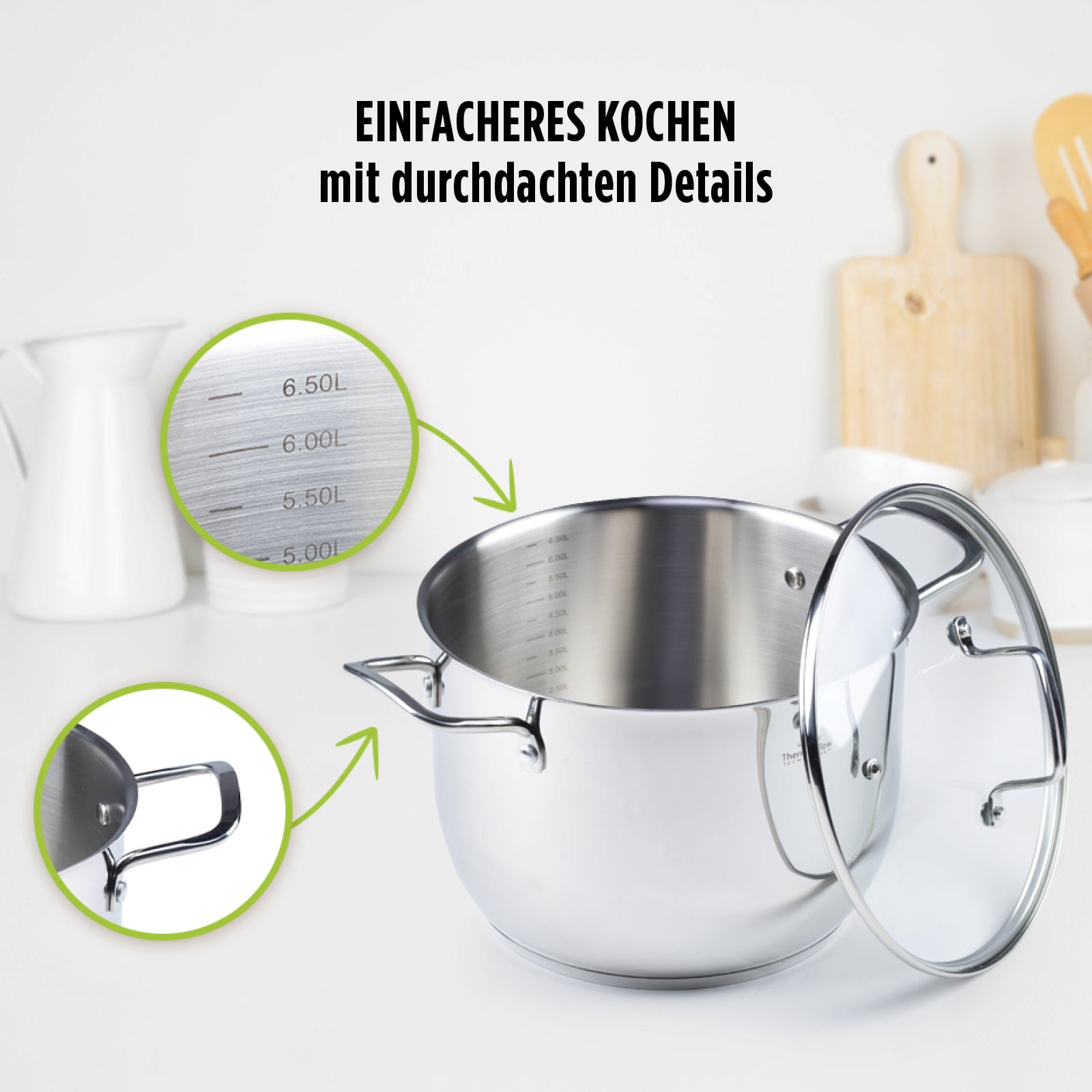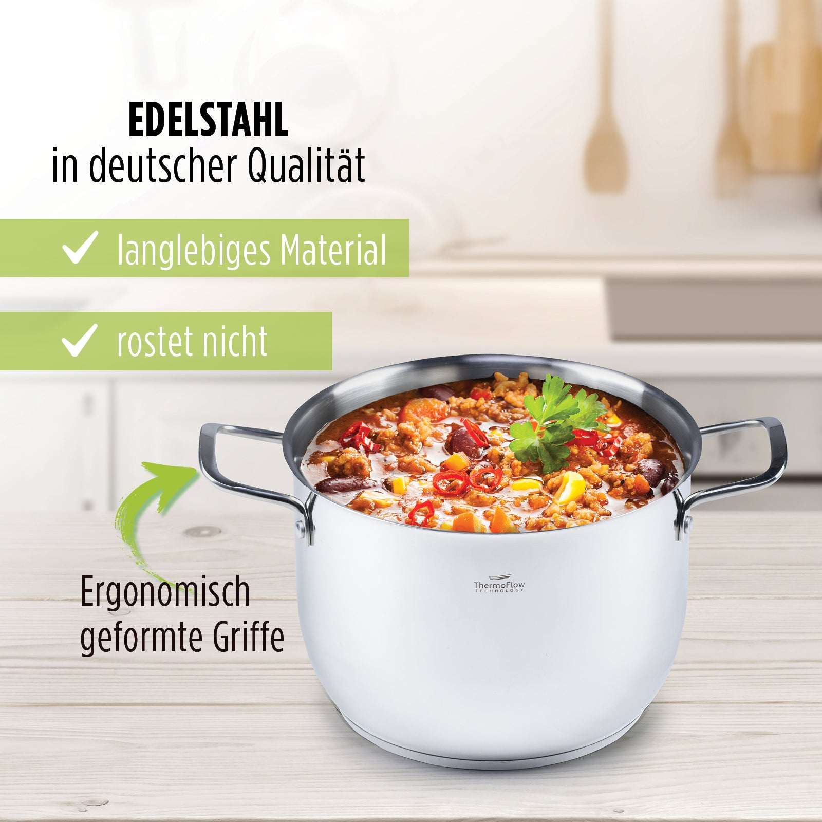 - Deutscher Qualitäts-Edelstahltopf 18/10 mit 3-lagigem Schlagboden für Haltbarkeit, lange Lebensdauer, schnelles Erhitzen und gleichmäßiges Garen.