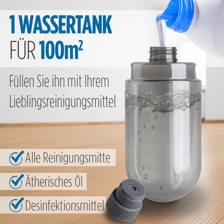 - Das Ausbringen der Flüssigkeit ist wirklich einfach: Füllen Sie einfach Wasser und Reinigungsmittel in den Tank.