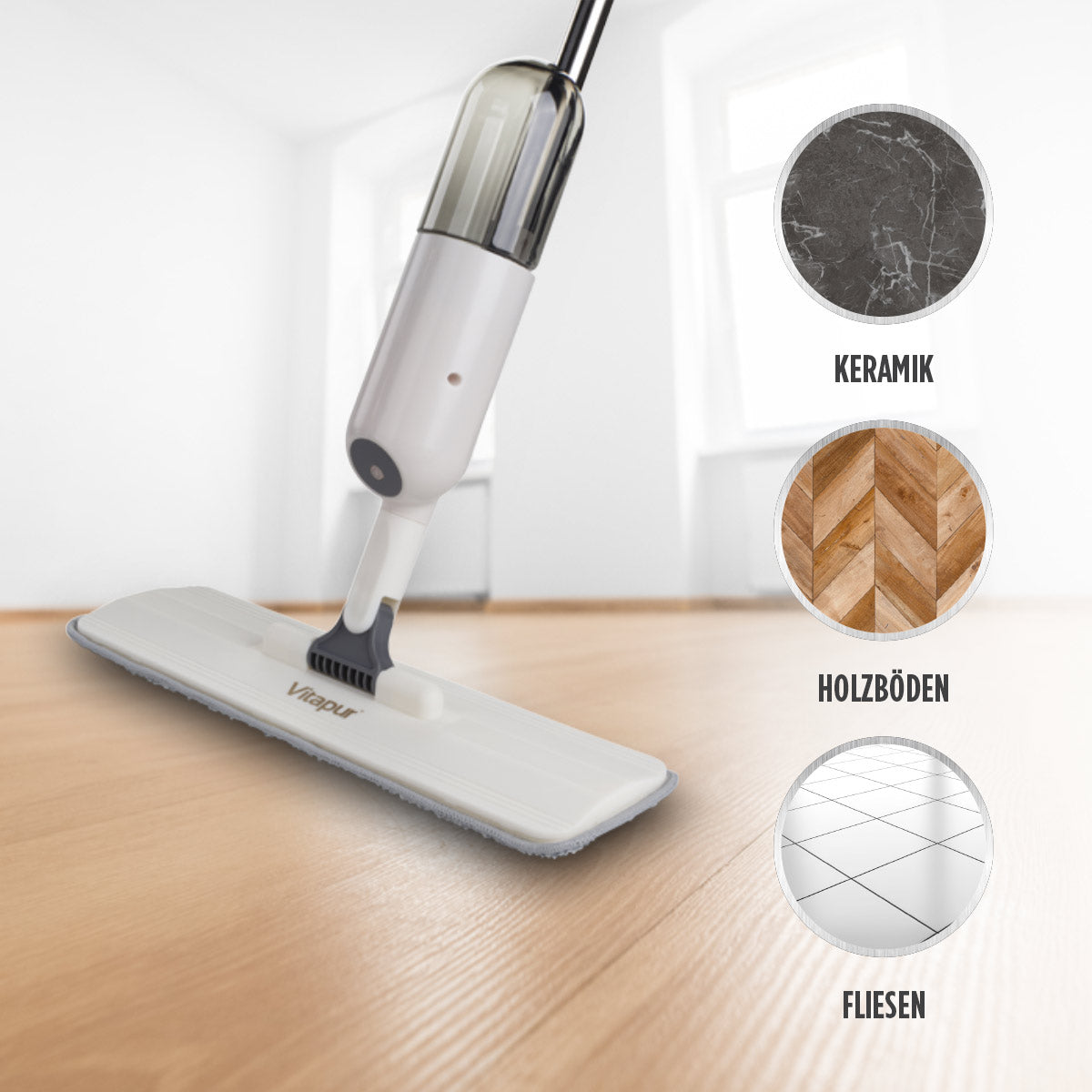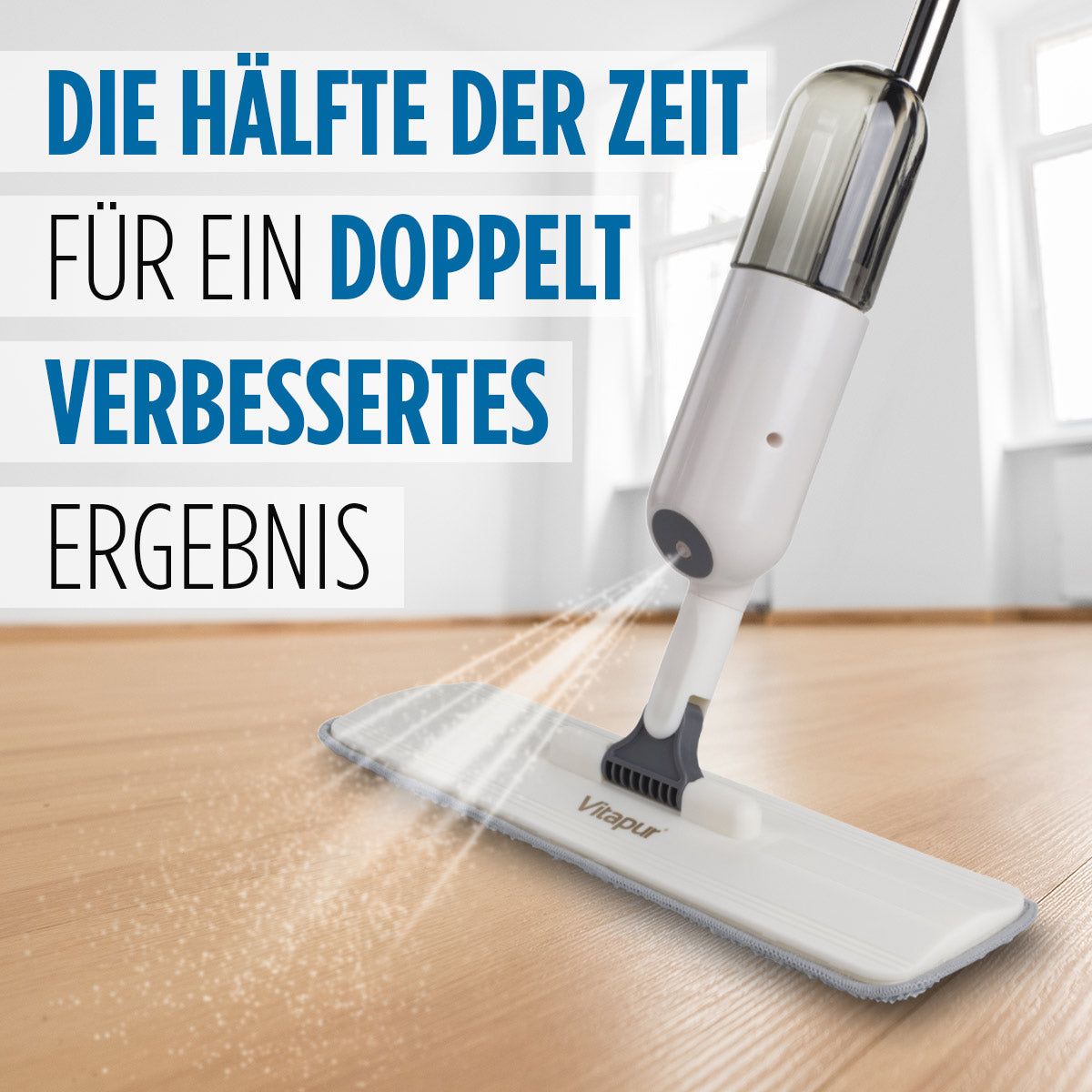 Mit dem Vitapur Sprühwischer wird das Reinigen und Wischen Ihrer Böden einfacher! Verabschieden Sie sich vom Einweichen der Reinigungspads in Wasser und lernen Sie den Spray Mop kennen, der das Wasser mit einfachen Klicks versprüht. Der ergonomisch geformte Stiel und die gut durchdachte Länge des Stiels ermöglichen es Ihnen, ohne Bücken und Beugen und ohne Rückenschmerzen zu reinigen. Mit nur einem Nachfüllen des Wassertanks können Sie bis zu 100 m2 Fläche reinigen! Geeignet zum Wischen einer Vielzahl von Oberflächen: Laminat, Parkett, Marmor, Vinyl, Linoleum und Fliesen. Der um 360° drehbare Griff ist so konzipiert, dass er auch die schwer zugänglichen Stellen leicht erreicht. Das Set enthält außerdem 2 Mikrofaserpads.