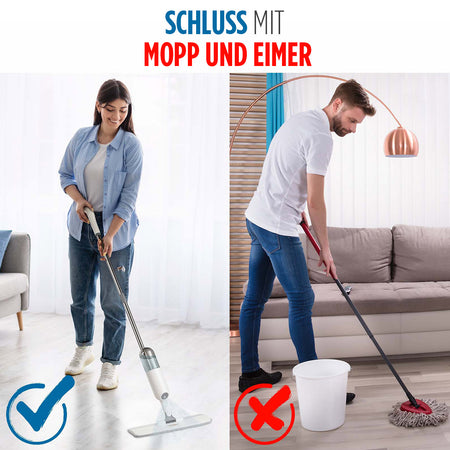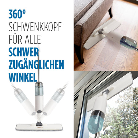 Der um 360° drehbare Reinigungskopf am Stiel erleichtert die Reinigung, so dass Sie jetzt auch die schwer zugänglichen und staubigsten Stellen in Ihrer Wohnung erreichen können. Sie können auch unter Stühlen, Betten, Sofas und anderen schwer zugänglichen Stellen reinigen, ohne die Möbel unnötig zu verschieben. Der Sprühwischer ist außerdem extrem leicht, einfach zu transportieren und für Ferienunterkünfte geeignet: Wohnungen, Ferienhäuser oder Wohnwagen.